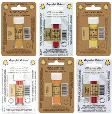 These are powder colours which can be used in three ways. Their main use is for brushing onto sugarwork and in particular flowers. They may also be mixed directly into sugar paste, though this would be far less effective than using paste colour.
